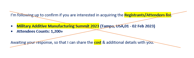 Unfortunately, emails are circulating that offer to sell attendee/registration lists for the Military Additive Manufacturing Summit. These emails are sent by scammers impersonating DSI.